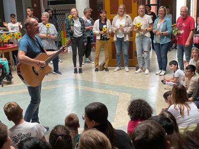 So durften alle Neulinge durch einen eigens aufgestellten Türrahmen treten,sich vorstellen und wurden daraufhin mit einer Sonnenblume und einem Gitarrenständchen in die Schulgemeinschaft aufgenommen.