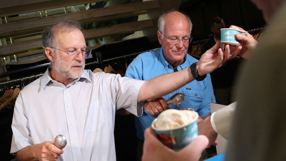 Gründer Ben Cohen und Jerry Greenfield bei einer Verteilaktion 2019