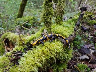 Foto (Wolfgang Lissak): Im Blaubachtal queren Salamander einen asphaltierten Weg,um von ihrem Winterquartier zum Laichgewässer zu gelangen. Ein Schutzprojekt soll dafür sorgen,dass die Tiere nicht mehr den Weg queren und somit nicht mehr überfahren werden.
