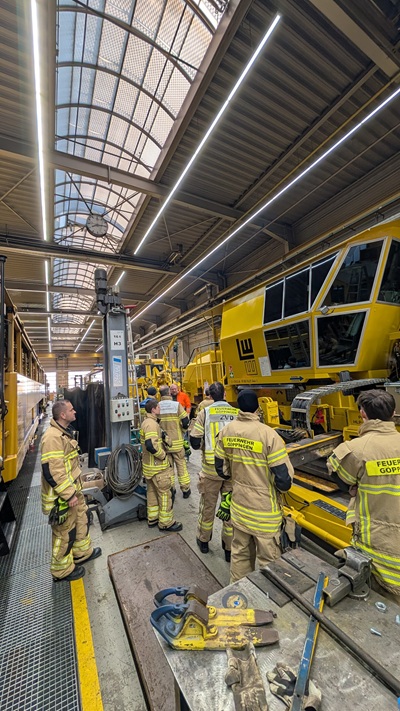 Der direkte Blick auf Spezialfahrzeuge,technische Einrichtungen und sicherheitsrelevante Details vor Ort ermöglicht dabei ein deutlich besseres Verständnis als jede theoretische Schulung. Während des Besuchs konnten die Einsatzkräfte moderne Instandhaltungsfahrzeuge und Lokomotiven aus nächster Nähe kennenlernen.